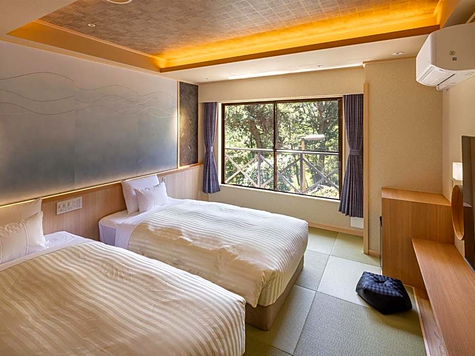 Guests will have a special experience as this twin room provides a sauna. The twin room includes a private bathroom, well-fitted with a bath, a shower, a bidet, a hairdryer and slippers. The spacious air-conditioned twin room offers a flat-screen TV with satellite channels, tatami, soundproof walls, a safe deposit box as well as mountain views. The unit offers 3 beds.