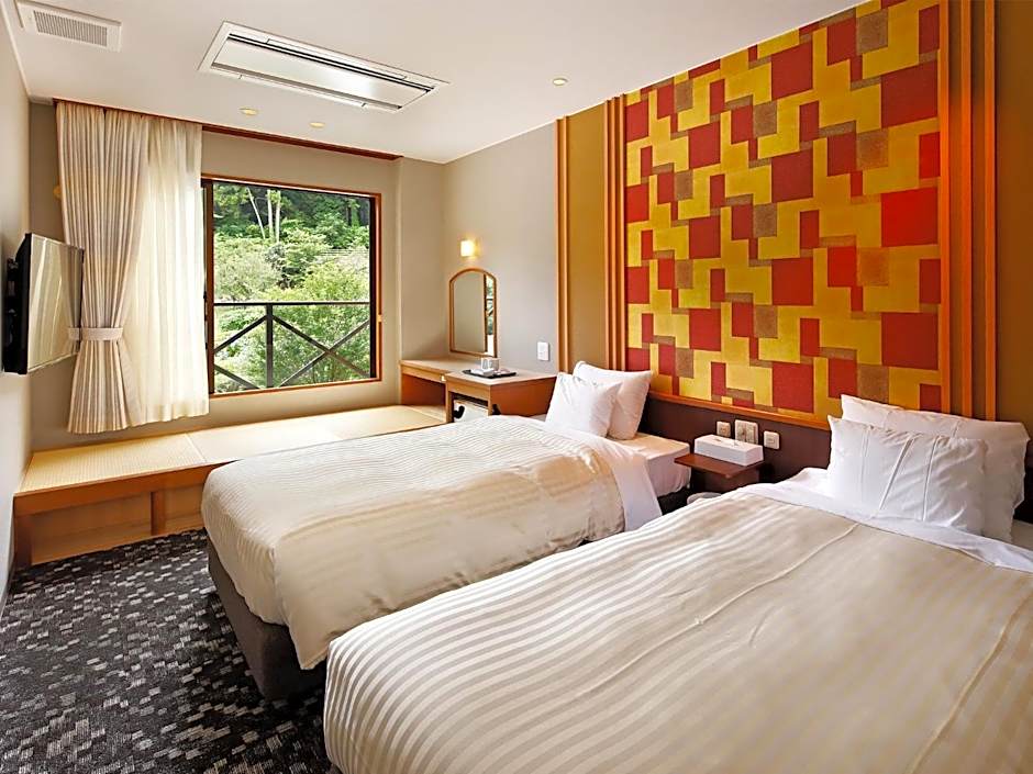 Guests will have a special experience as this twin room provides a sauna. The twin room includes a private bathroom, well-fitted with a bath, a shower, a bidet, a hairdryer and slippers. The spacious air-conditioned twin room offers a flat-screen TV with satellite channels, tatami, soundproof walls, a safe deposit box as well as mountain views. The unit offers 3 beds.